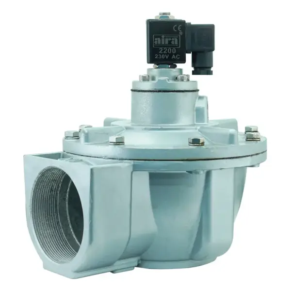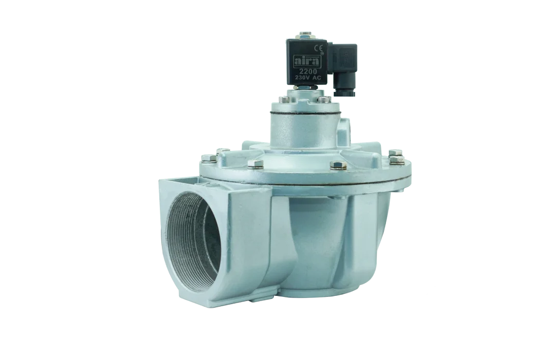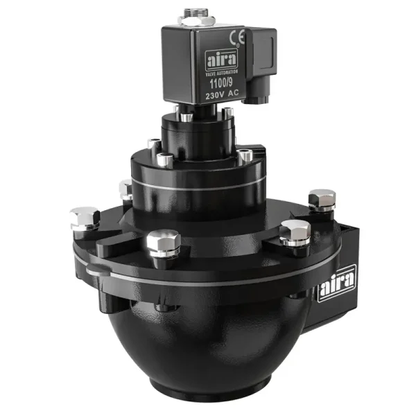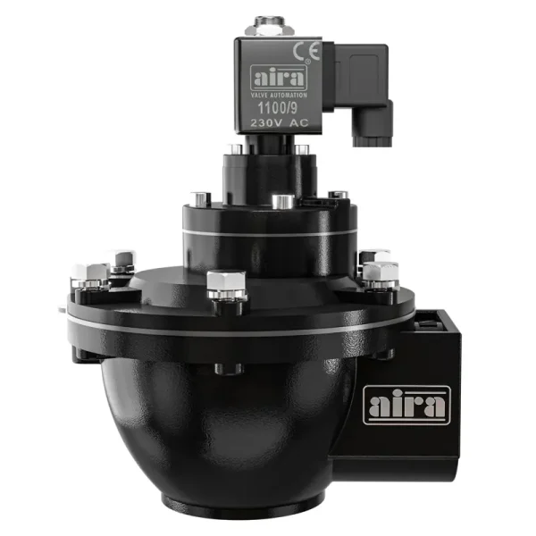 “aira” Offers high performance diaphragm operated valve with threaded ports. Available with integral pilot or as remotely piloted valve. Outlet at 90° to inlet.