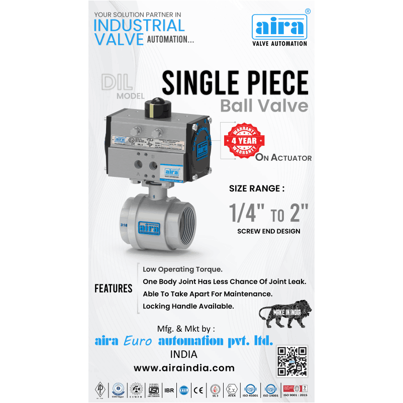 Aira Euro Automation is one of the best Pneumatic Single Piece Ball Valve Manufacturers in Ahmedabad, India. Offers fire-safe design, and efficient operation. Single Piece ball valves are designed for precision flow control. Our Ball Valves operate on a quarter-turn mechanism, ensuring seamless flow control with minimal pressure drop.